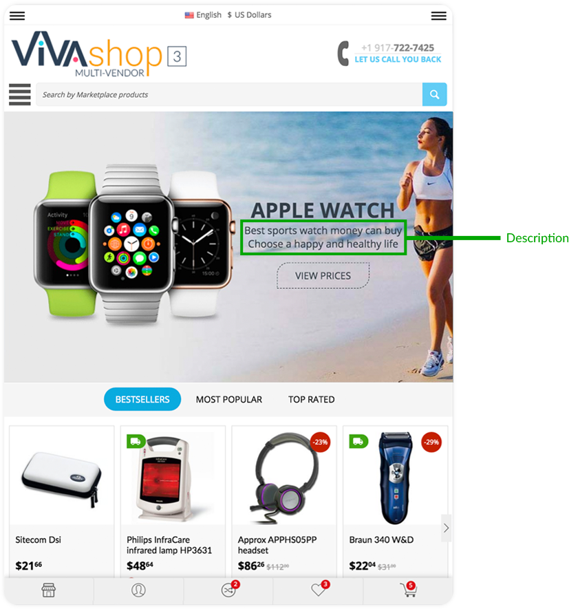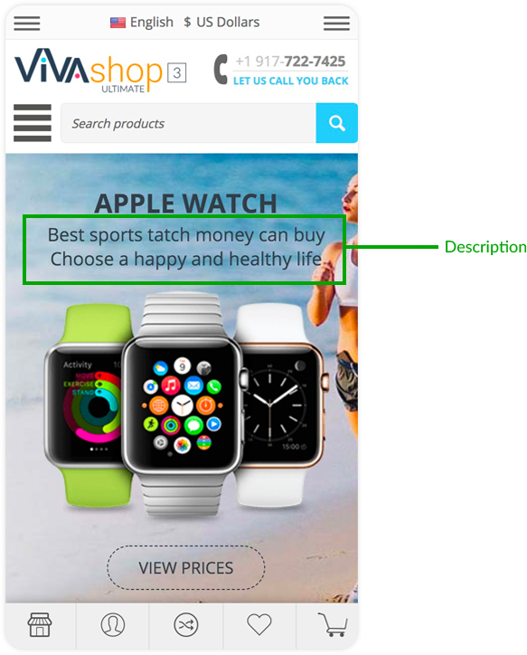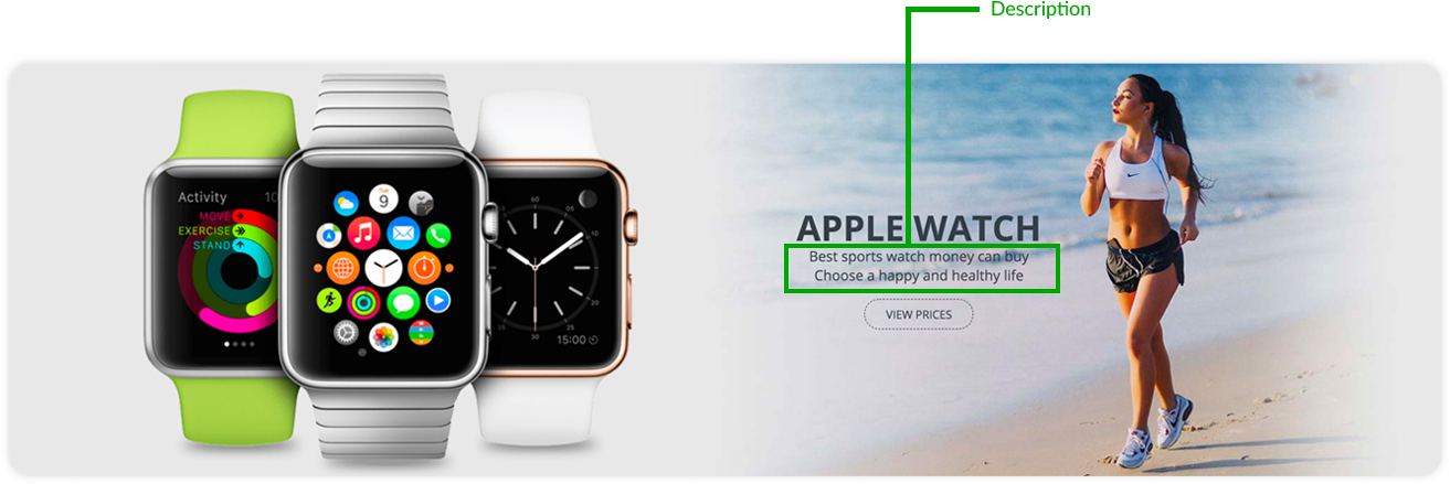 - Center - Place the description text in the center, inside the Info Block (this is the option that we have selected for the demo “VIVAshop - Homepage - Main slider - Banner 1” banner)
