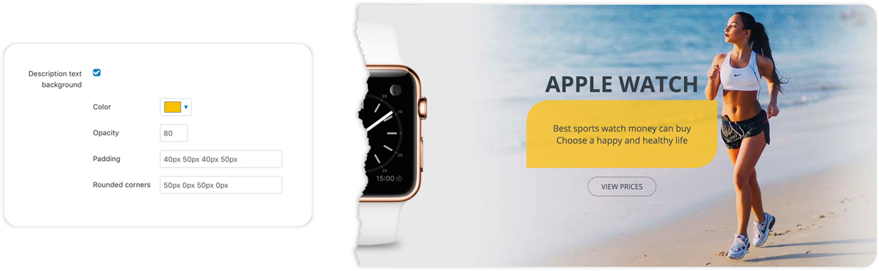 - Rounded corners - Set the corners for your description text background. The setting format is same as margins and paddings, meaning “TLpx TRpx BRpx BLpx”, where “TL” is the value for the top left corner, “TR” is the value for the top right corner , “BR” is the value for the bottom right corner, and “BL” is the value for the bottom left corner. These values are in pixels. In the above example we have used “50px 0px 50px 0px”, meaning that the top left and bottom right of the background have a radius of 50px, whereas the top right and bottom left corners do not have any roundness at all.