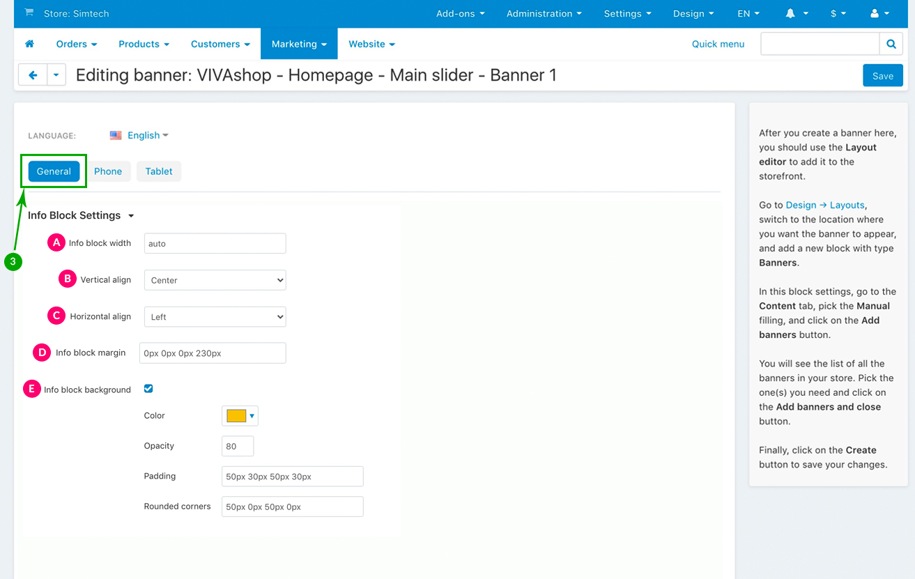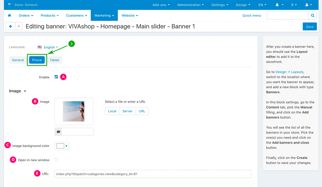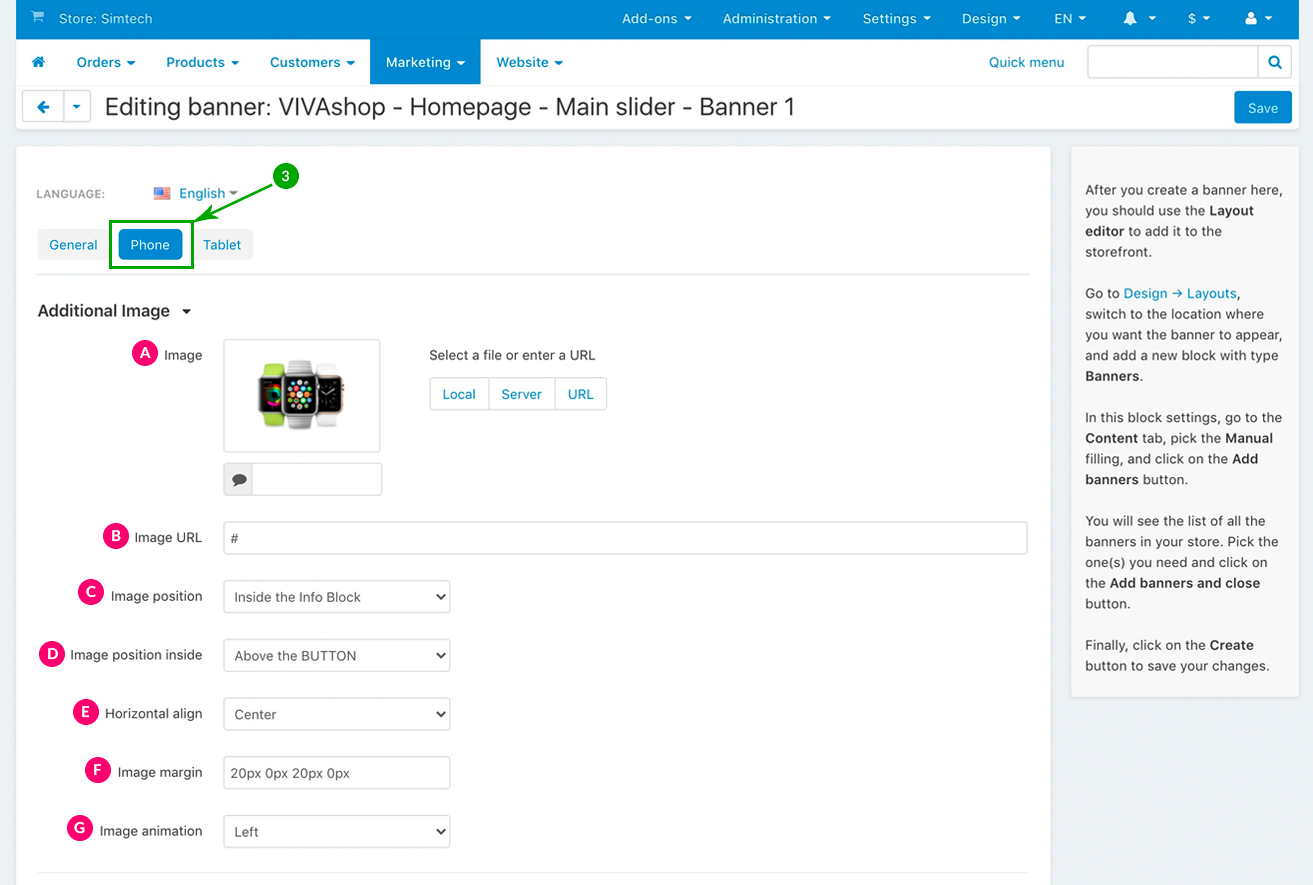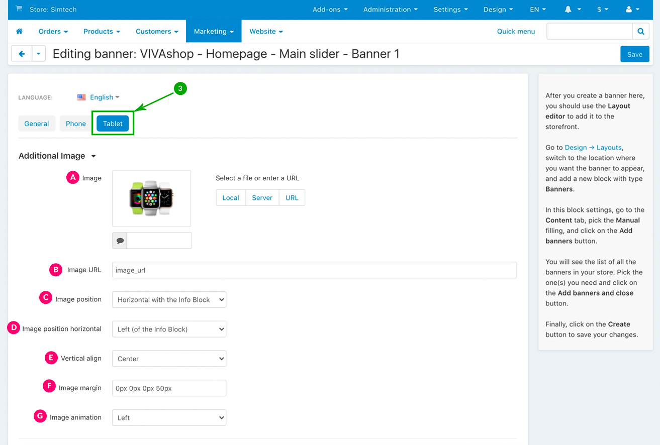 For the “VIVAshop - Homepage - Main slider - Banner 1” banner we have used the following options for sections C, D and E: