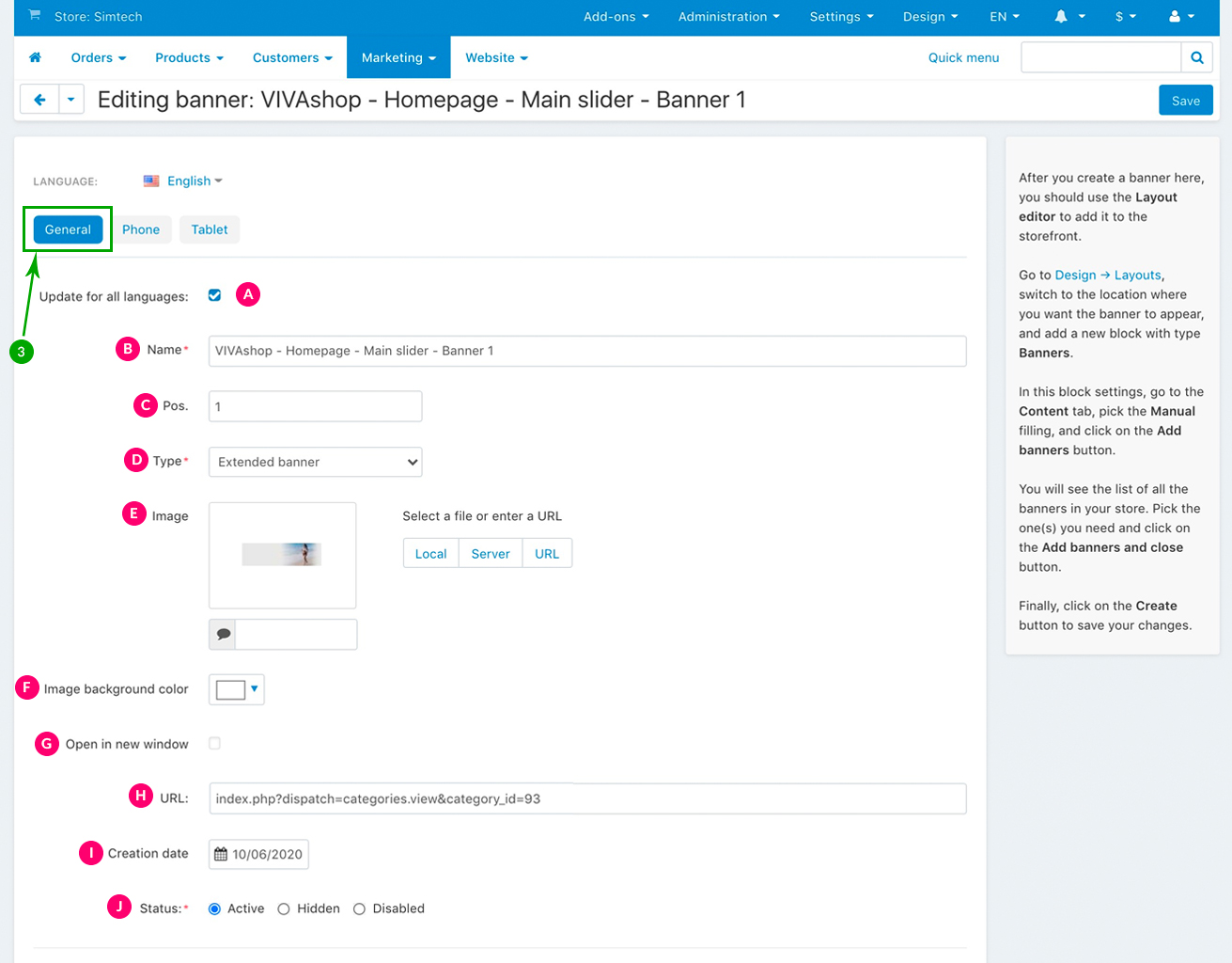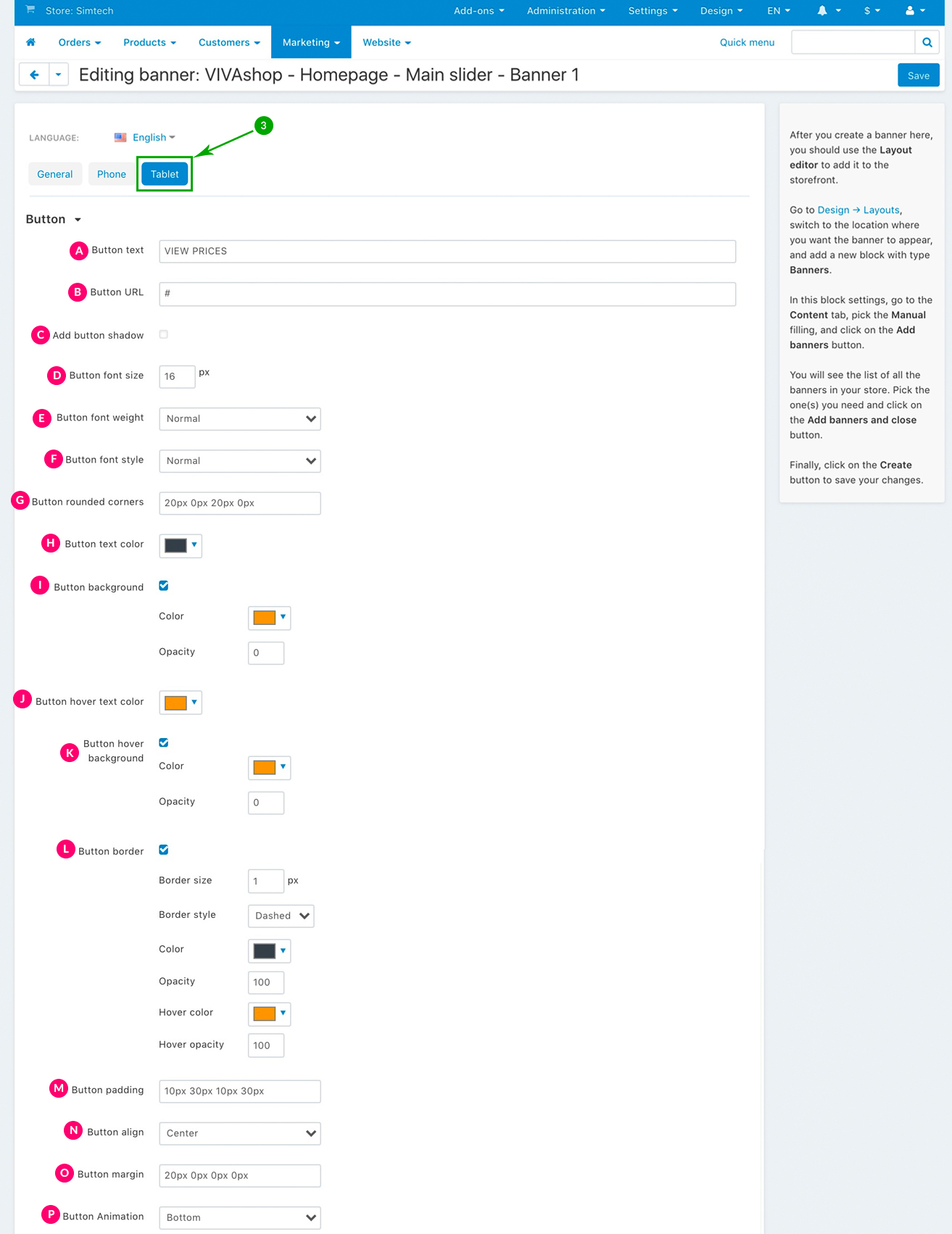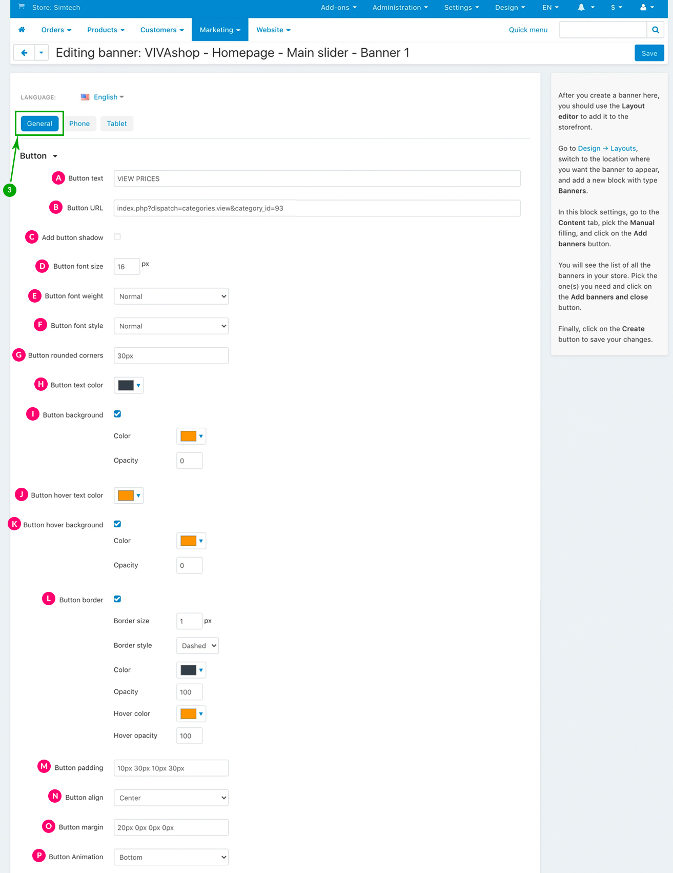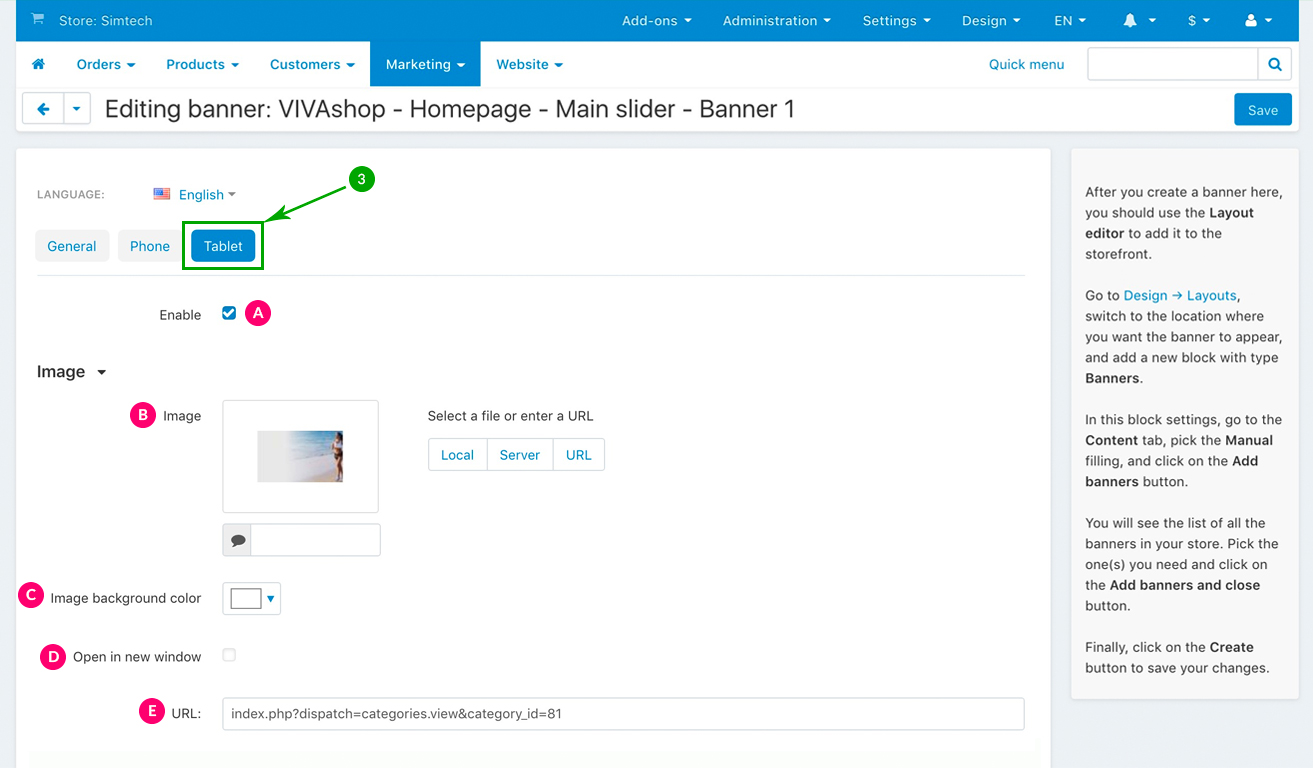 For the “VIVAshop - Homepage - Main slider - Banner 1” banner we have used the following options for sections C, D and E: