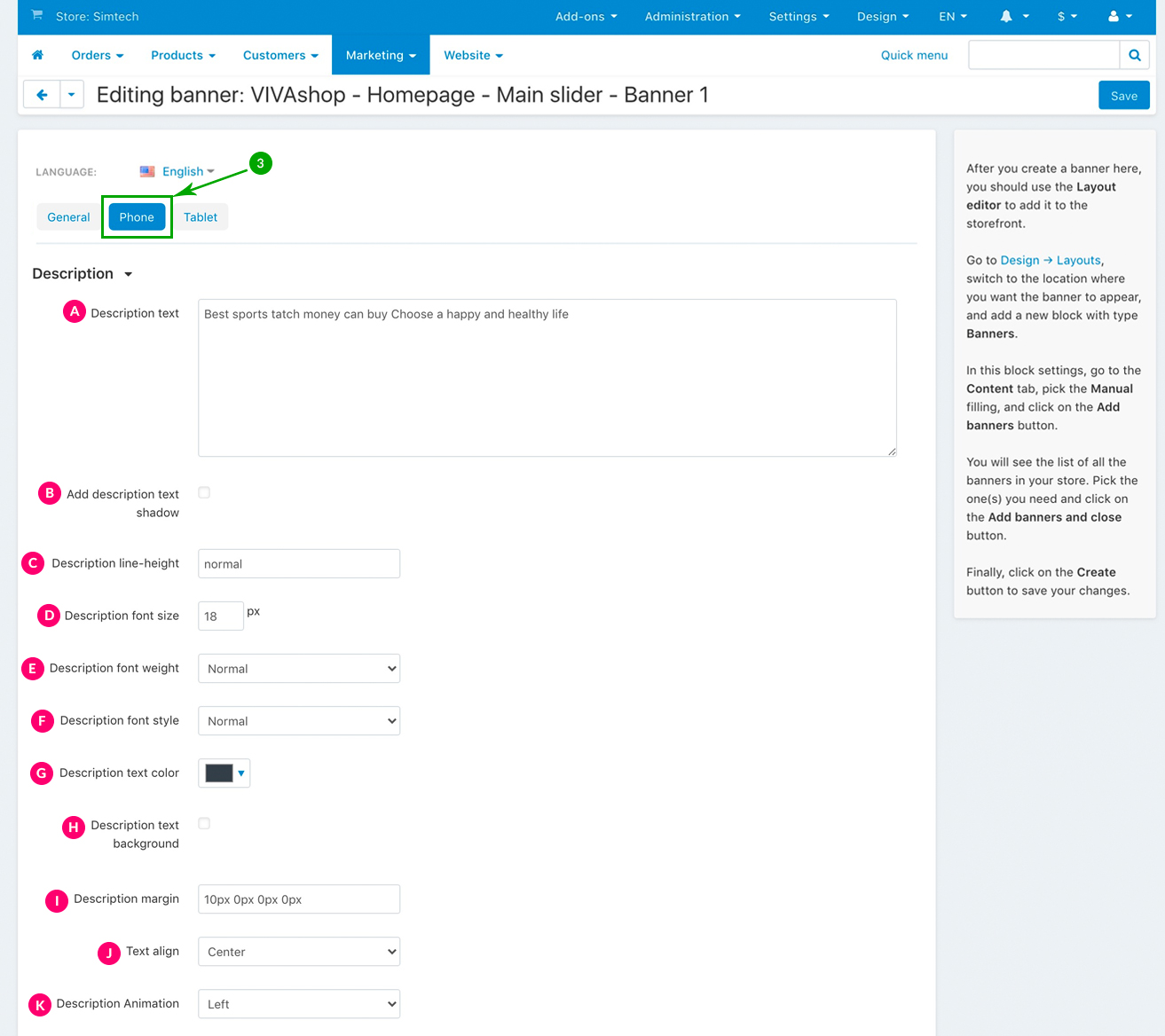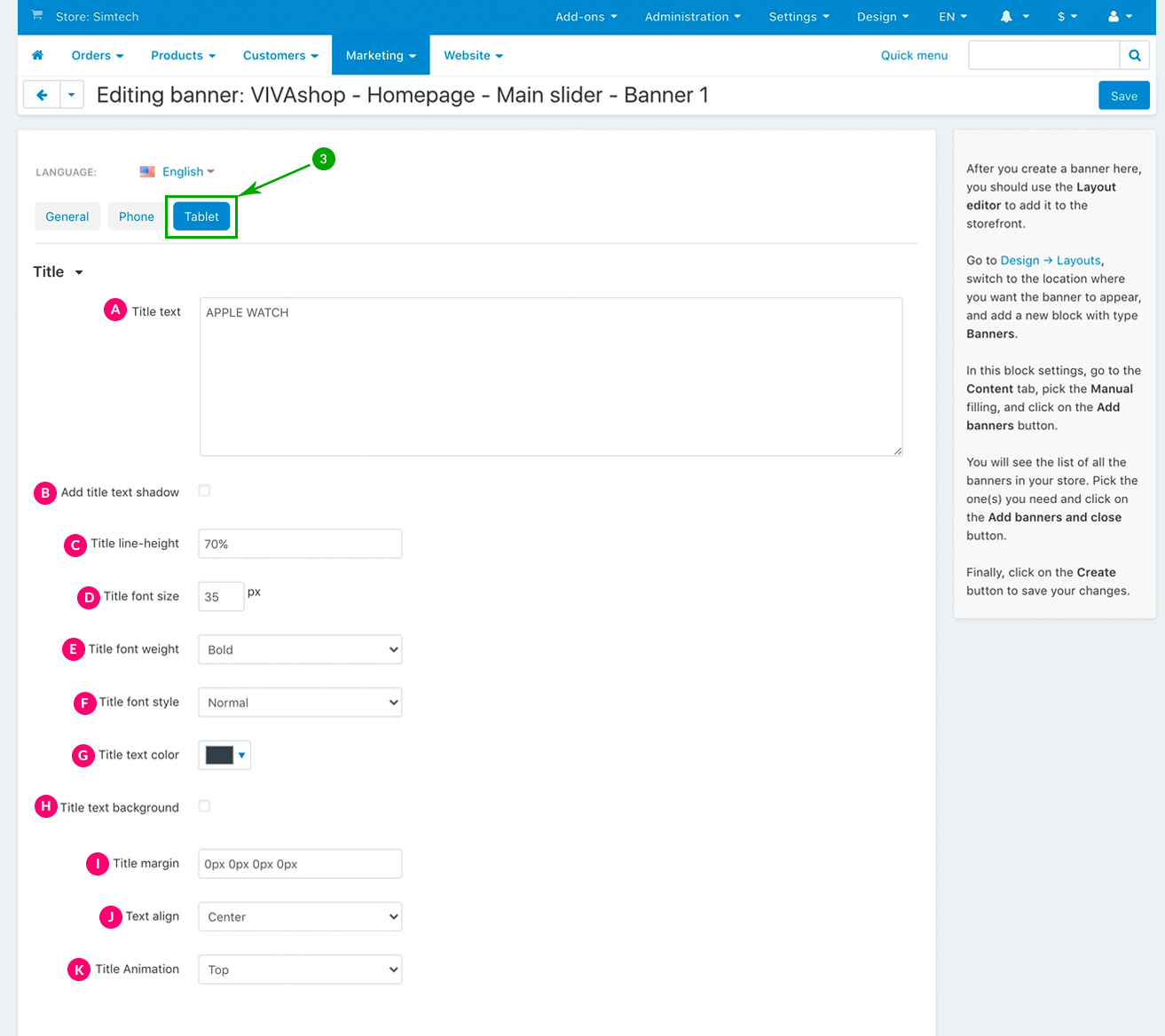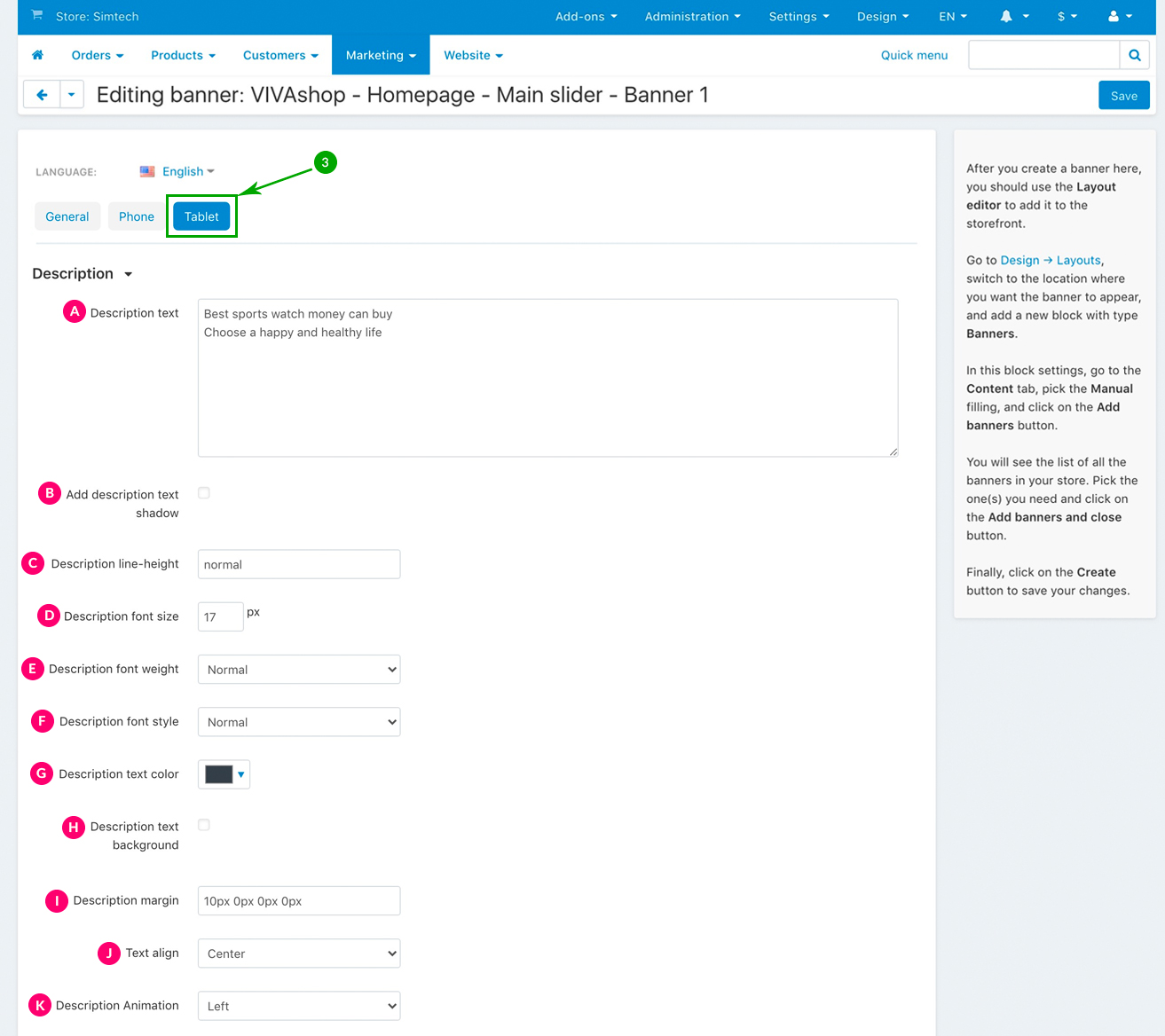 For the “VIVAshop - Homepage - Main slider - Banner 1” banner we have used the following options for sections C, D and E:
