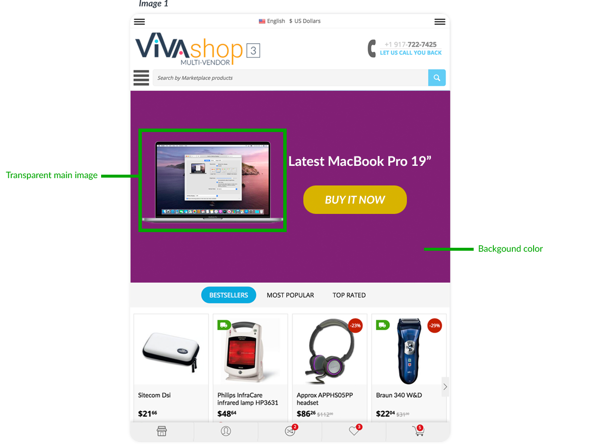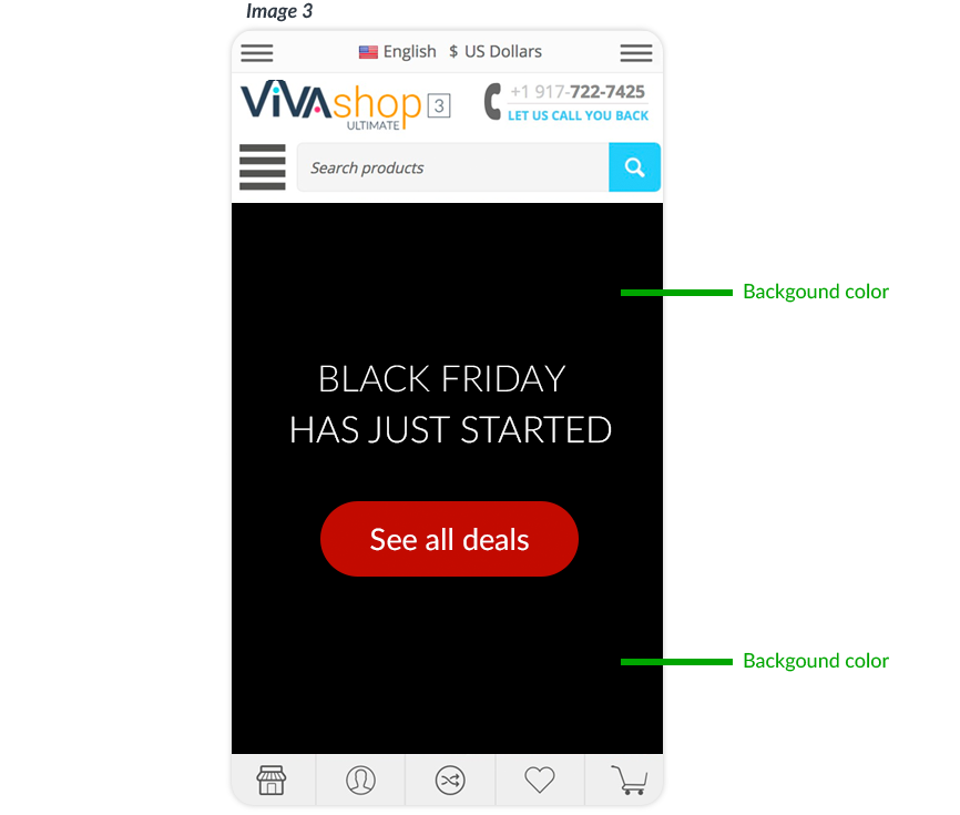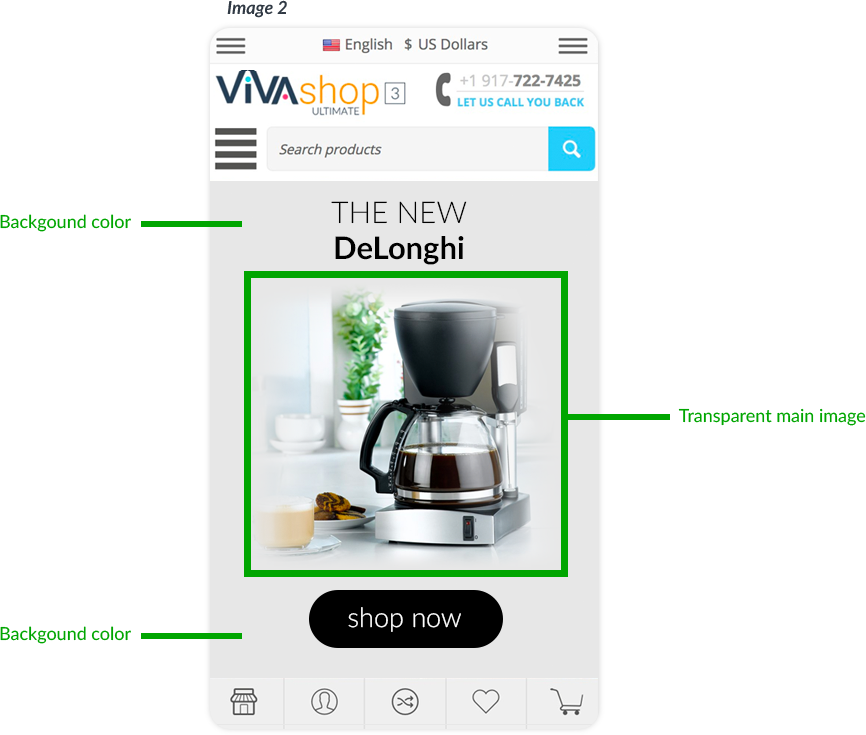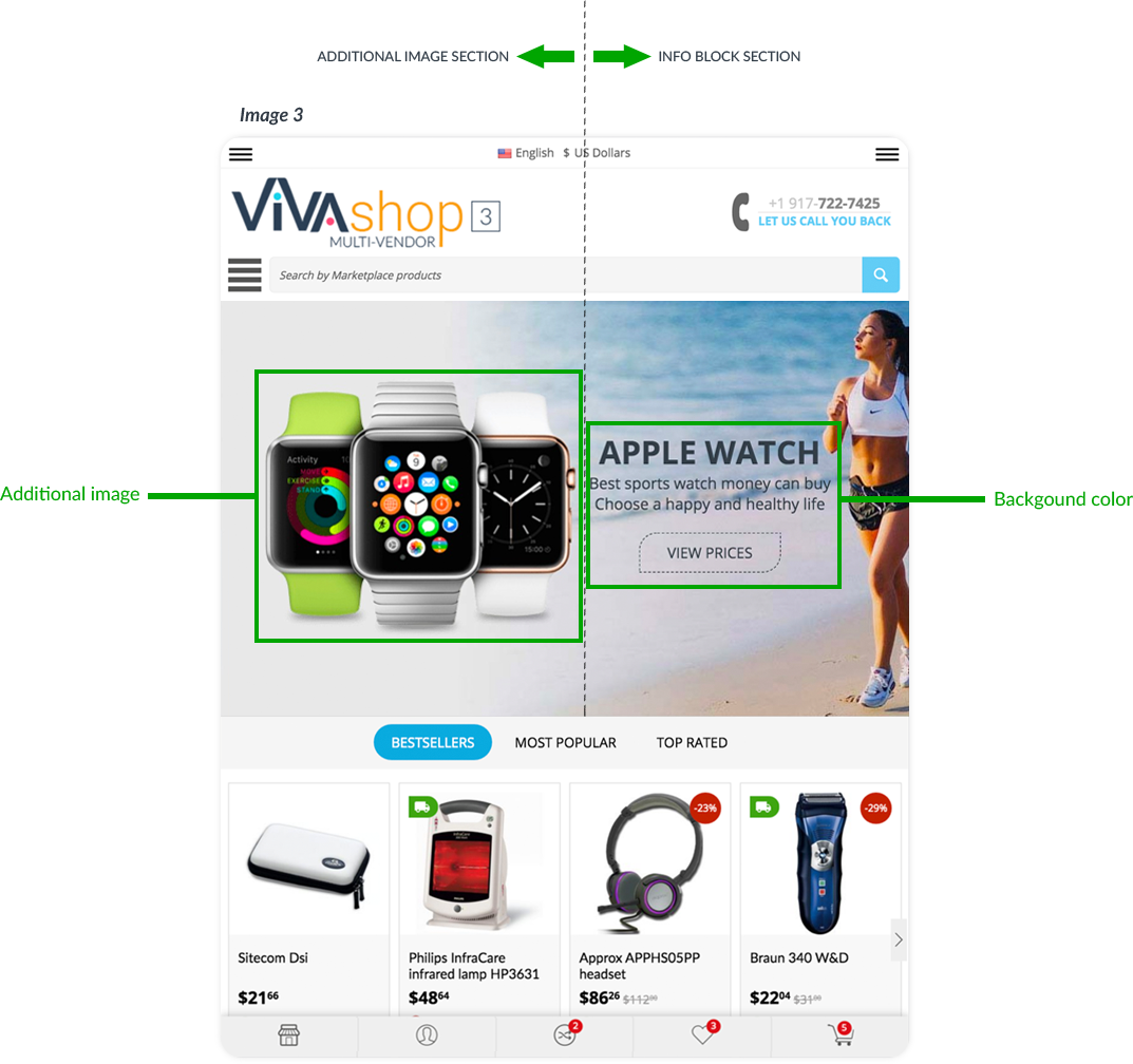 For the “VIVAshop - Homepage - Main slider - Banner 1” banner we have chosen the “Bottom” option, so the Additional Image will come from the bottom.