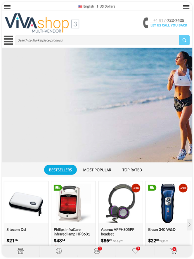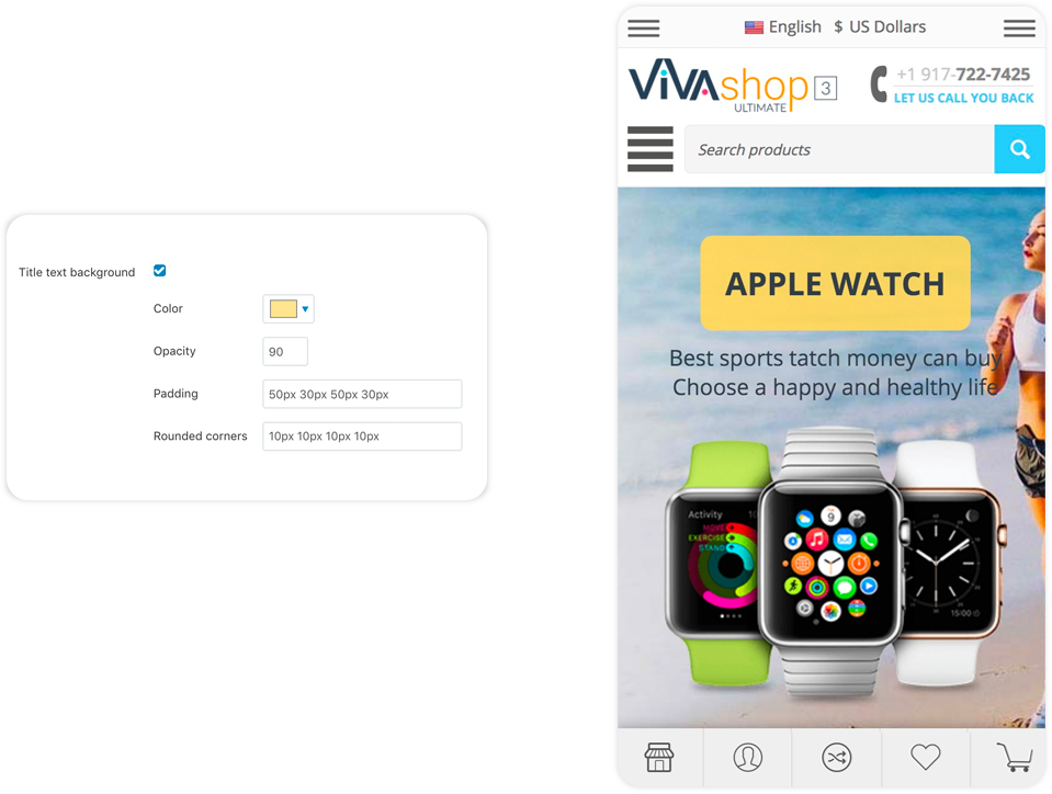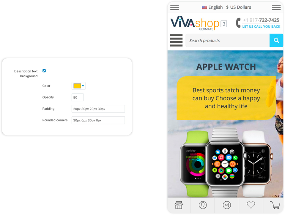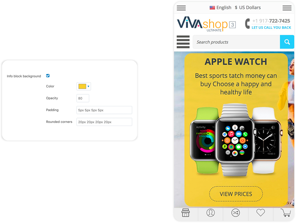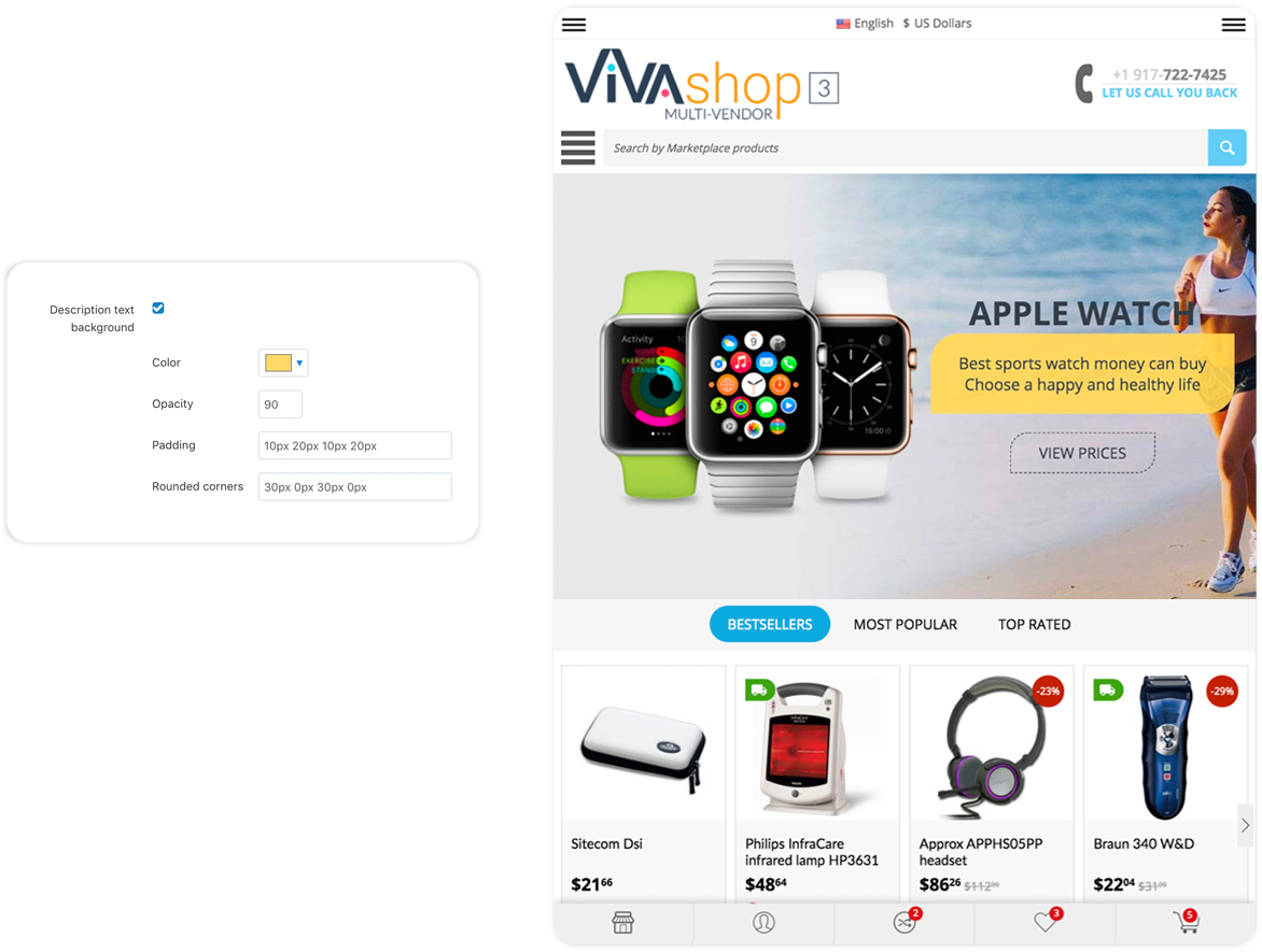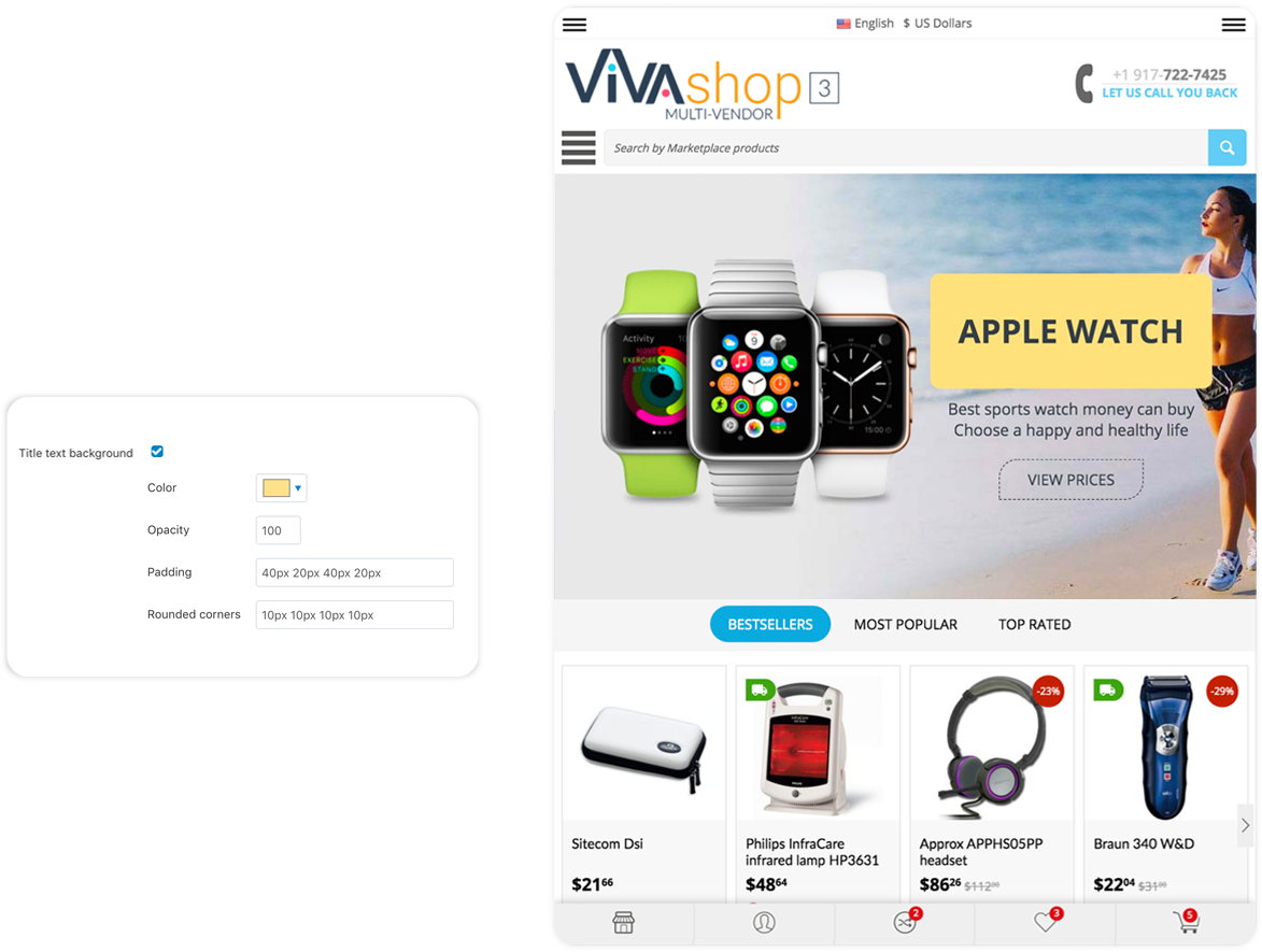 The “Extended Banners Pro” add-on have plenty of options so you can build beautiful responive banners: add your custom images, add and customize your own HTML text, buttons, fonts, colors, links, image and text animations, image and text positions, backgrounds, etc... Any banner you create can be an Extended Banner. For VIVAshop Multi-Vendor version, vendors can also create Extended Banners for their own store homepages, thus being able to create beautiful stores in your Marketplace, increasing its quality.