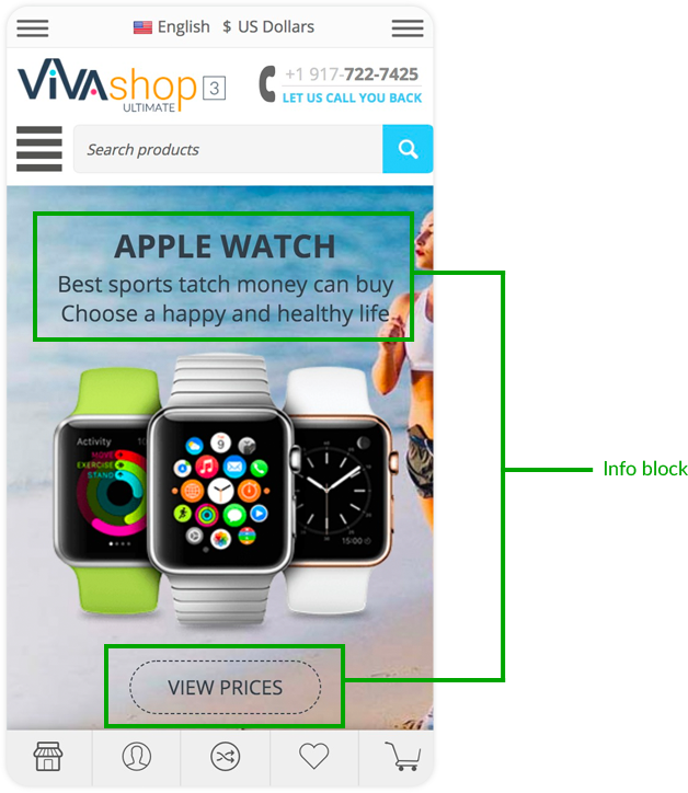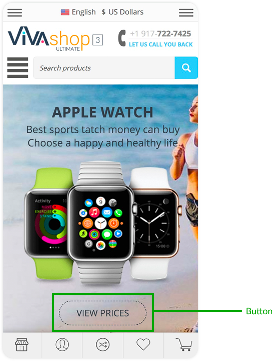 - Center - Place the button in the center, inside the Info Block (this is the option that we have selected for the demo “VIVAshop - Homepage - Main slider - Banner 1” banner)