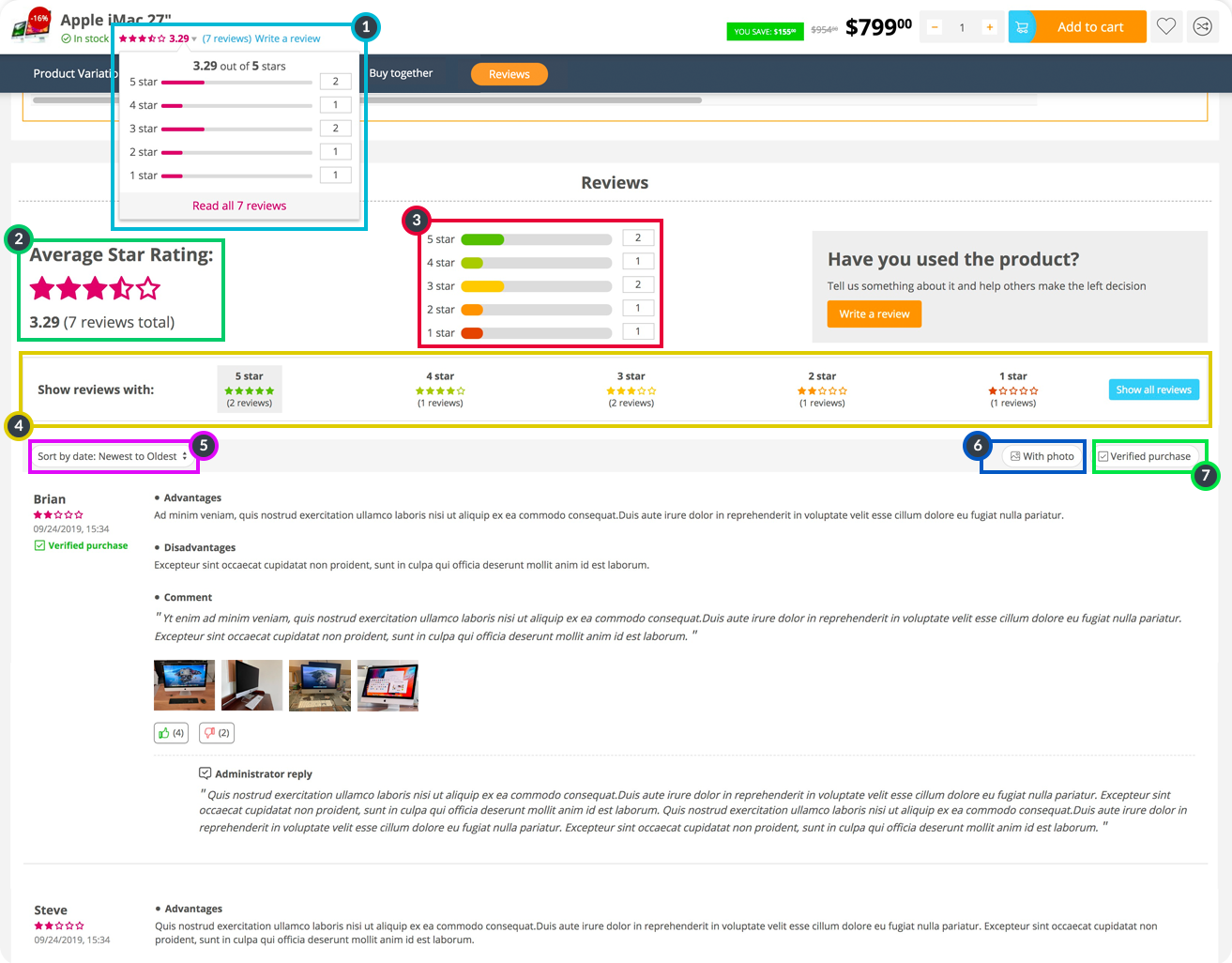 3 - The same chart as on point 1 may be seen under the “Reviews” tab as well. This time, the chart is nicely colored, so you may better visualize the product rating levels