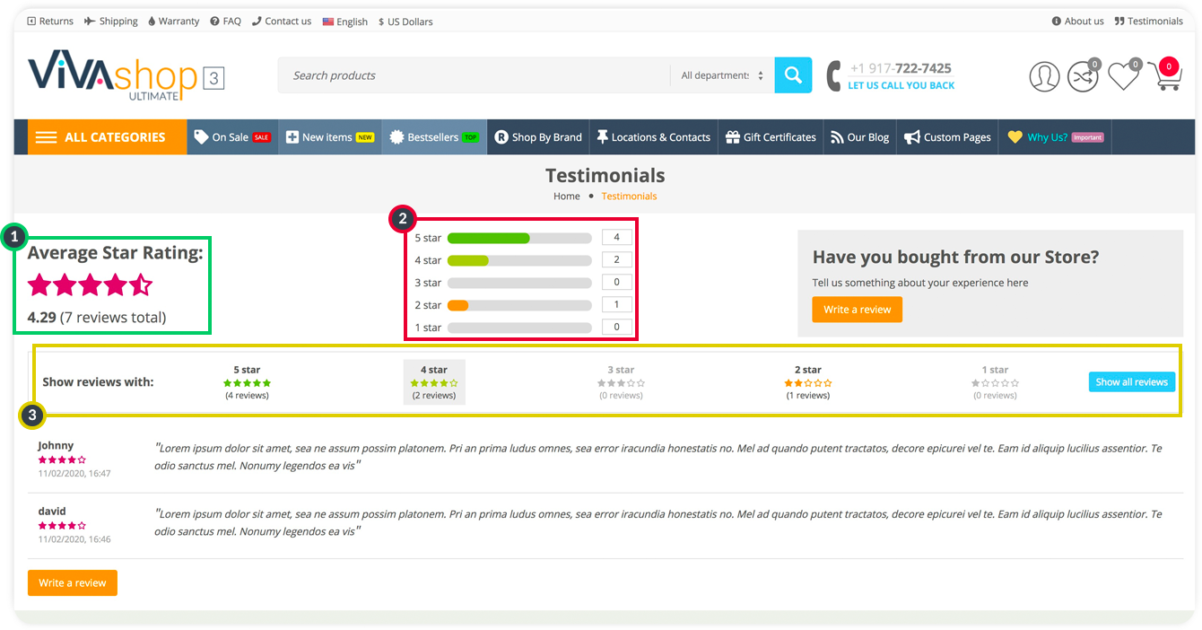 2 - Like on the Product Page and Testimonials page, the same nicely colored rating chart may be seen on the Vendor Store “Reviews” page as well. This chart indicates the number of ratings per each rating points so you may better visualize the ratings provided by customers to the Vendor Store