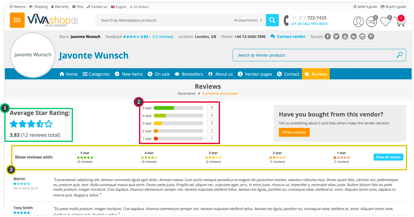 1 - Under the Vendor Store “Reviews” page you will find the “Average Star Rating“ from the total number of reviews provided by customers who bought from the respective Vendor Store