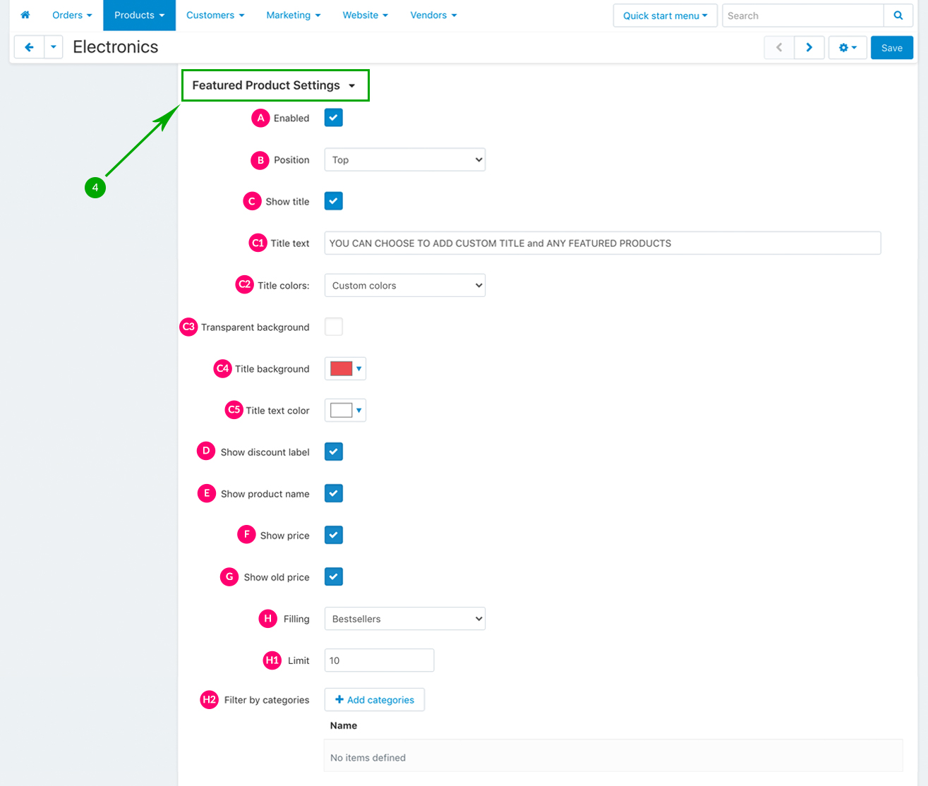 Under the “ET - Advanced Mega Menu” tab, scroll down until you get to the “Featured Product Settings” section, and select the options for your featured product scroller. Click on the top right blue “Save” button when you’re done.