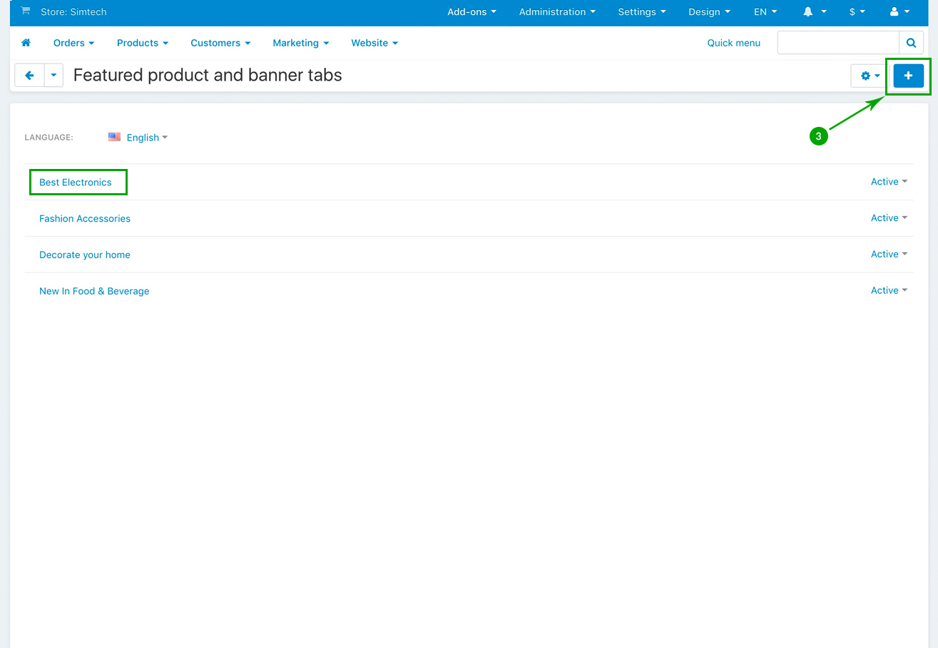In the next page click on the right side “Plus” to add a new “Featured Products And Banner Tab”. For exemplification, we have cliked on the tab called “Best Electronics” that we have created on our demo site.