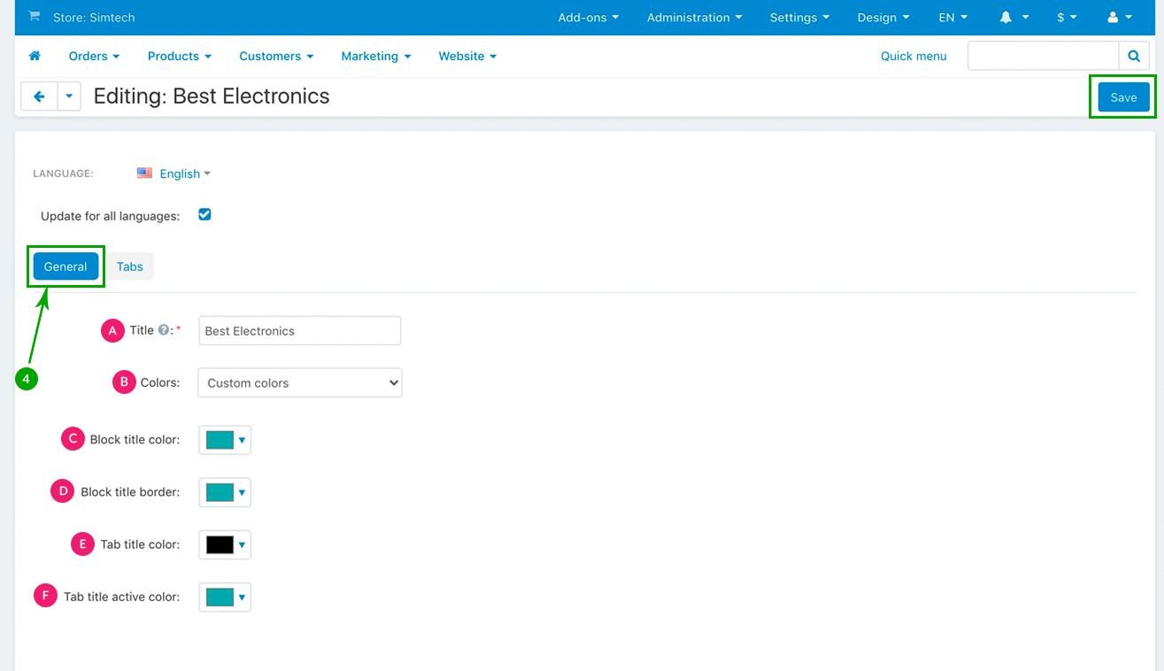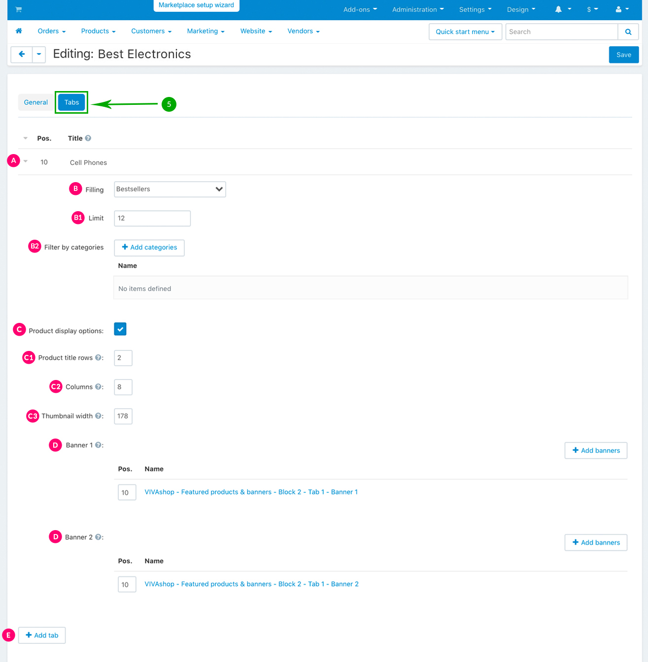 Before you start, please meka sure to have your banners already created. So, go to “Marketing” - “Banners” and ceate your banner. You can also create advanced banners with the help of the ”Extended Banners Pro” add-on. Note that you can add up to 2 (two banners) per each tab. Should you want to add 2 banners, the recommended width of each banner is 785px, and the banners heights is at your own choice, but both banners need to have the same height. On our demo site we have used a height of 276px for each banner. Should you want to add 1 banner, the recommended width is 1580px, and the banner height is at your own choice.. On our demo site we have used a height of 276px for the banner.