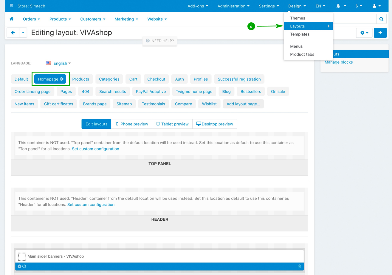Once you have created your content for the “Featured Product And Banner Tabs”, all you need to do now is to simply allocate this content to their respective blocks. For example, we have placed the ”Best Electronics” block on the homepage, so we need to allocate its content now. So, we need to go to “Design” - “Layouts” and click on the “Homepage” tab.