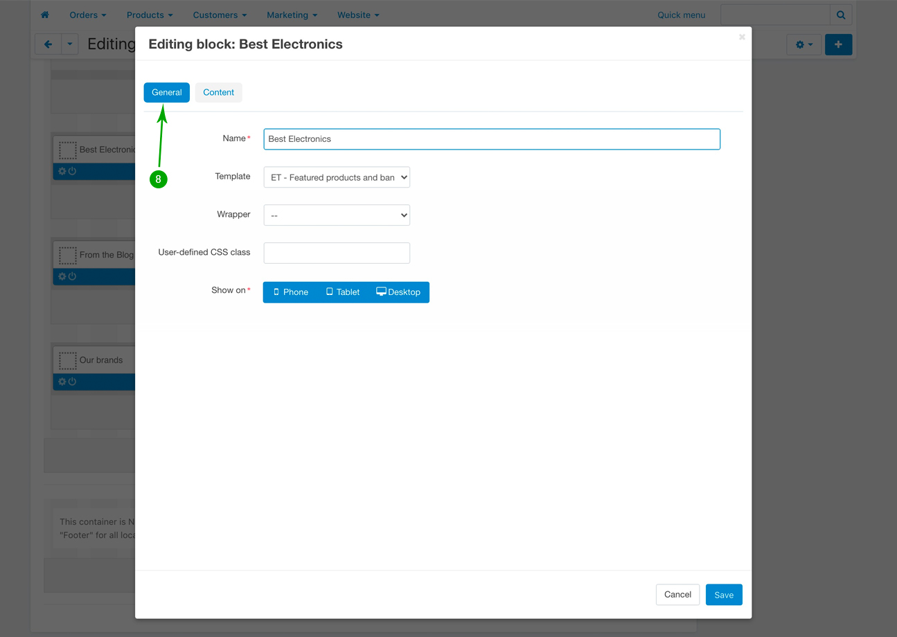 In the newly opened pop-up window, under the “General”, give your block your desired custom name. “Template” should remain “ET - Featured products and banners” .