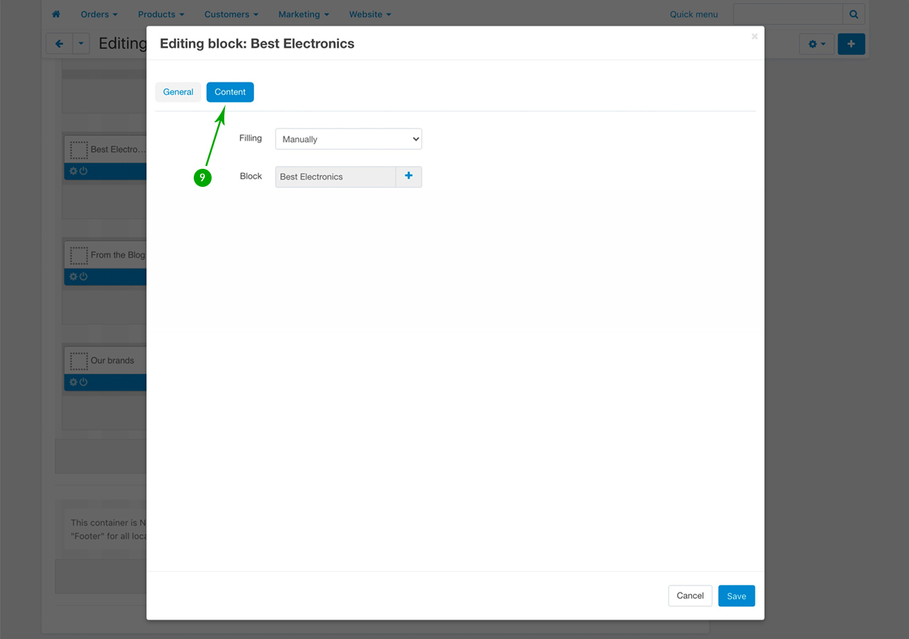 Next, under the “Content” tab, click on the “plus” sign from the ”Block” field, in the new page, choose “Best Electronics” block, then click on the bottom “Save” button