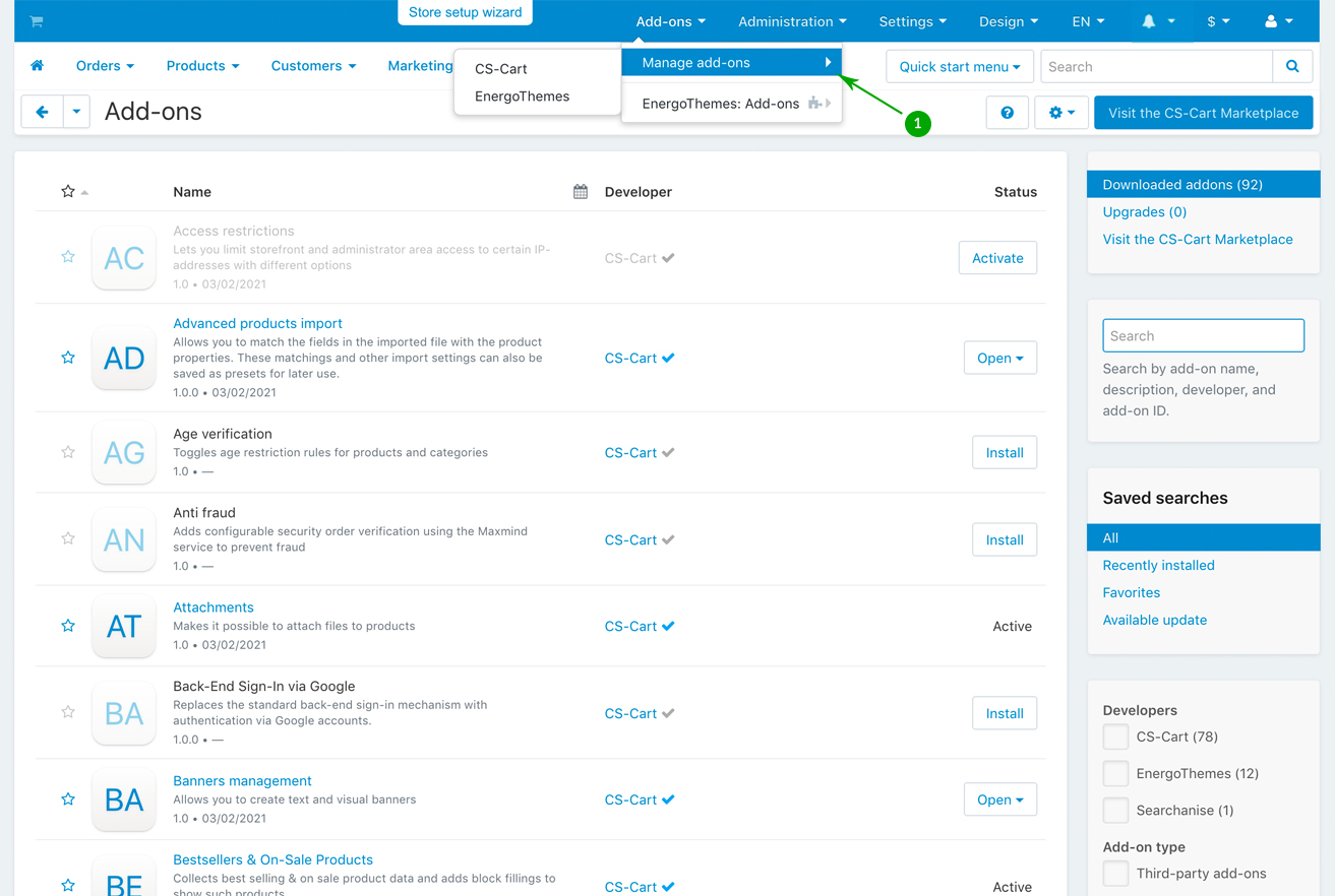 Log into your Administrator area of your CS-Cart installation and navigate to "Add-ons" - "Manage Add-ons"