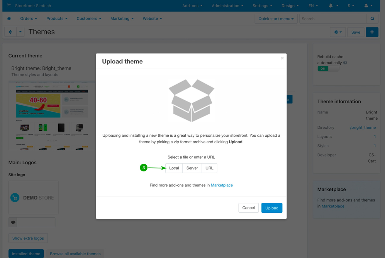 In the newly opened pop-up window under "Select a file or enter a URL" click on the "Local" button and locate the "theme" folder from your unzipped archive.