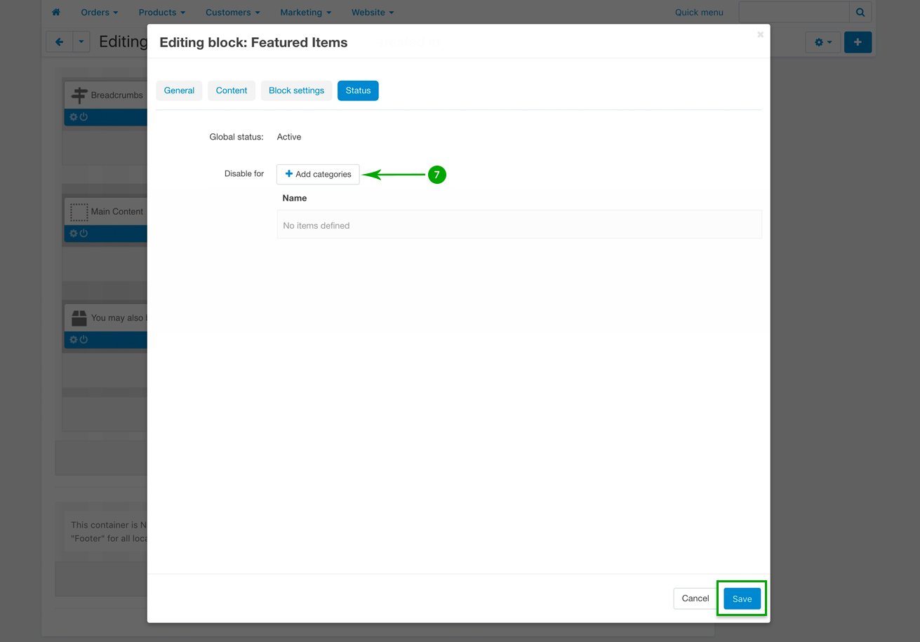 Finally, under the “Status” tab, choose if you want the sidebar “Featured Items” products block not to be displayed on certain categories, and in case you want so, click in the “Add categories” button and select your categories. Then simply click on the bottom blue “Save” button when you’re done