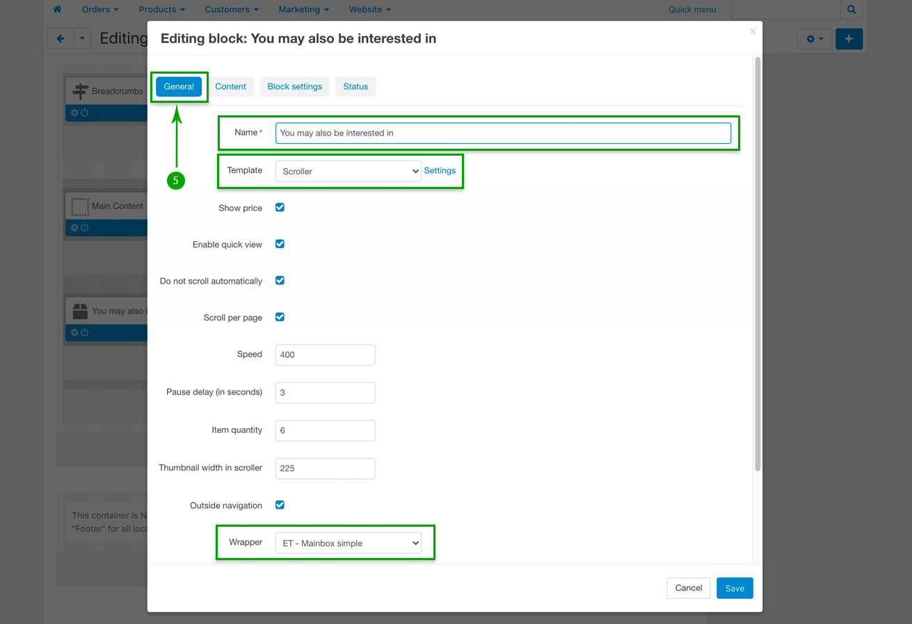 In the newly opened pop-up window, under the “General” tab, if you wish, change the block Name, as well as the other settings according to your preferences. The “Template” should however be “Scroller”, as well as the “Wrapper” should remain “ET - Mainbox simple”
