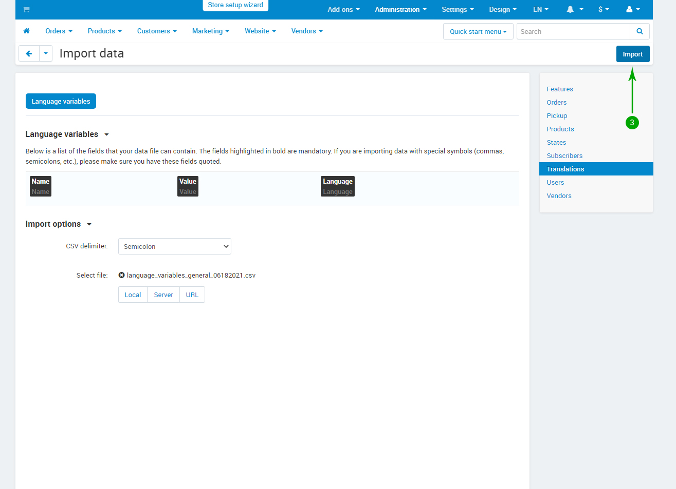 Log into your Administrator area of your CS-Cart installation and navigate to "Administration" - "Import data" - "Translations"